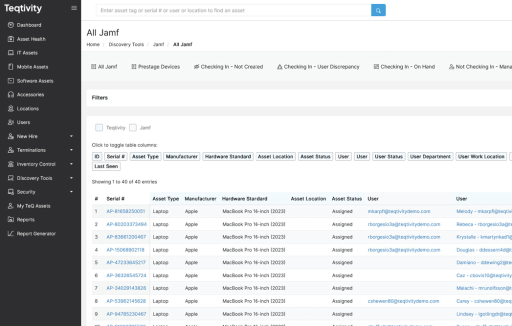 A modern asset dashboard must support seamless integration with discovery tools to enable real-time data accuracy. Teqtivity excels in this area by offering integrations with platforms like Workspace ONE, Intune, Chrome Devices, Jamf, Kandji, and MobilIron, which are accessible through the Discovery Tools tab. These integrations help sync asset data across multiple endpoints, reducing manual entry and enhancing lifecycle visibility.