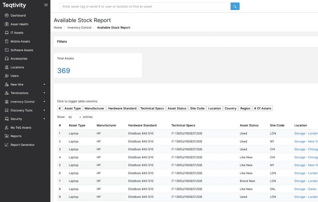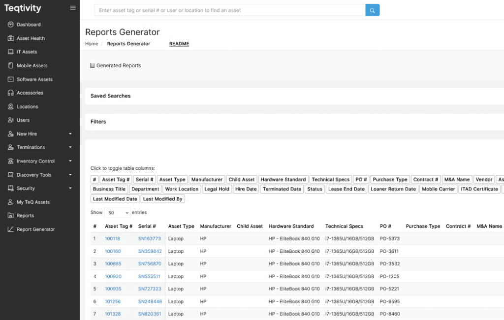 Yes, Teqtivity includes a powerful Report Generator that allows users to filter by over 30 fields, such as asset type, PO number, status, and legal hold. This enables customized insights for finance, IT, and compliance teams, enhancing the IT asset management strategy.