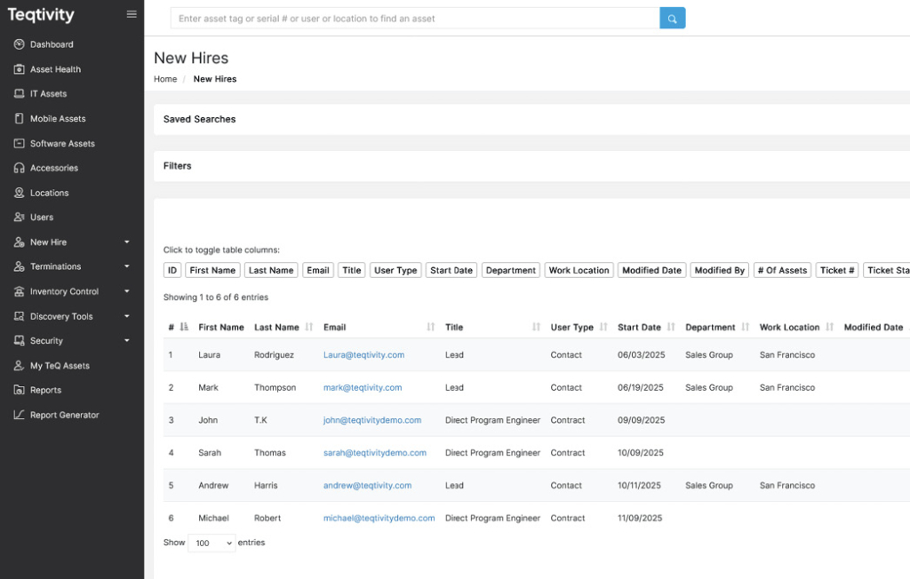 Efficient onboarding is a critical function of any asset dashboard, and Teqtivity streamlines this with its New Hire feature. This feature enables IT teams to track new employees, allocate assets in advance, and sync shipment and ticket statuses, all from a single view.