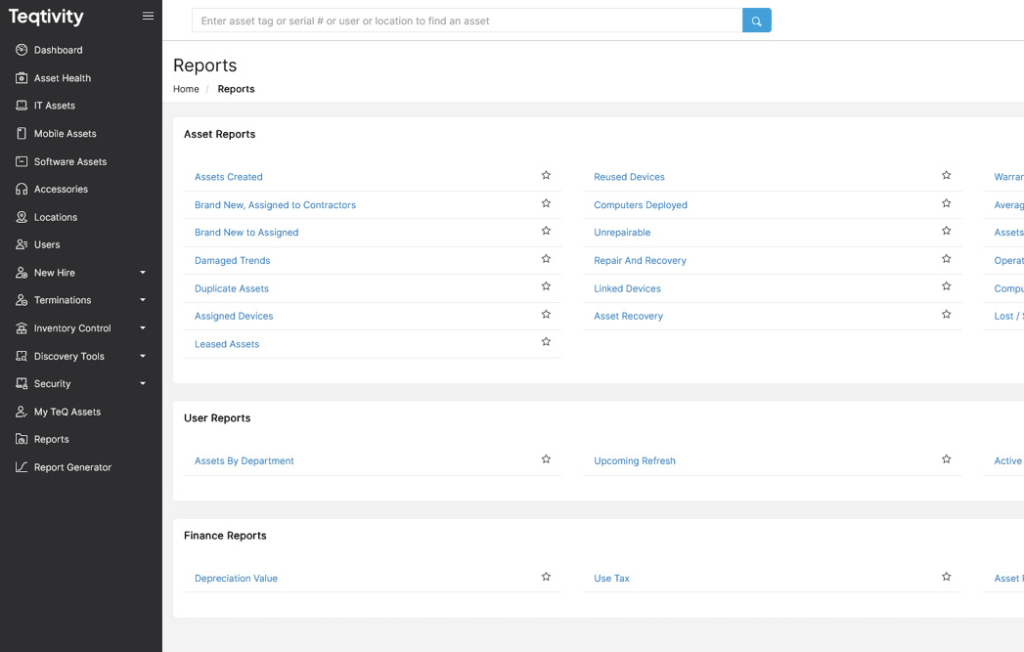 A top-tier asset dashboard must support in-depth reporting, and Teqtivity delivers this through three structured categories such as Asset Reports, User Reports, and Finance Reports. Each category provides valuable sub-reports like Damaged Trends, Lost/Stolen Value, Assigned Devices, Depreciation Value, and Asset Recovery. These detailed analytics help IT and finance teams track lifecycle progress, optimize cost efficiency, and enable compliance.