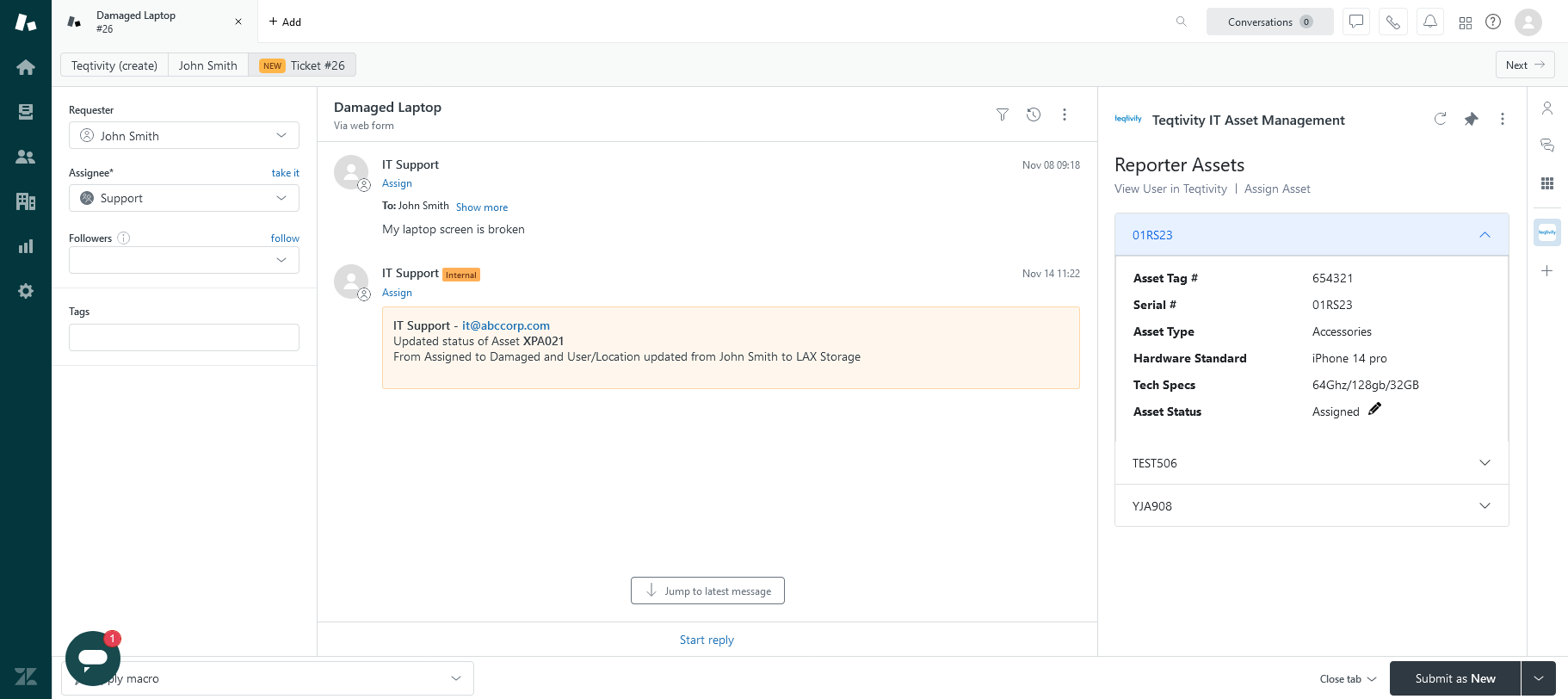 Zendesk is a widely used customer service platform designed to help teams manage and streamline support requests. The Teqtivity for Zendesk Plugin is a game changer that allows IT teams to view asset data directly within Zendesk tickets. Asset status changes are auto-synced to ensure both systems are accurate and consistently aligned. The integration also ensures accountability by tracking every asset-related action (e.g., who updated the asset and when), providing clear visibility and transparency across all asset-related tasks.