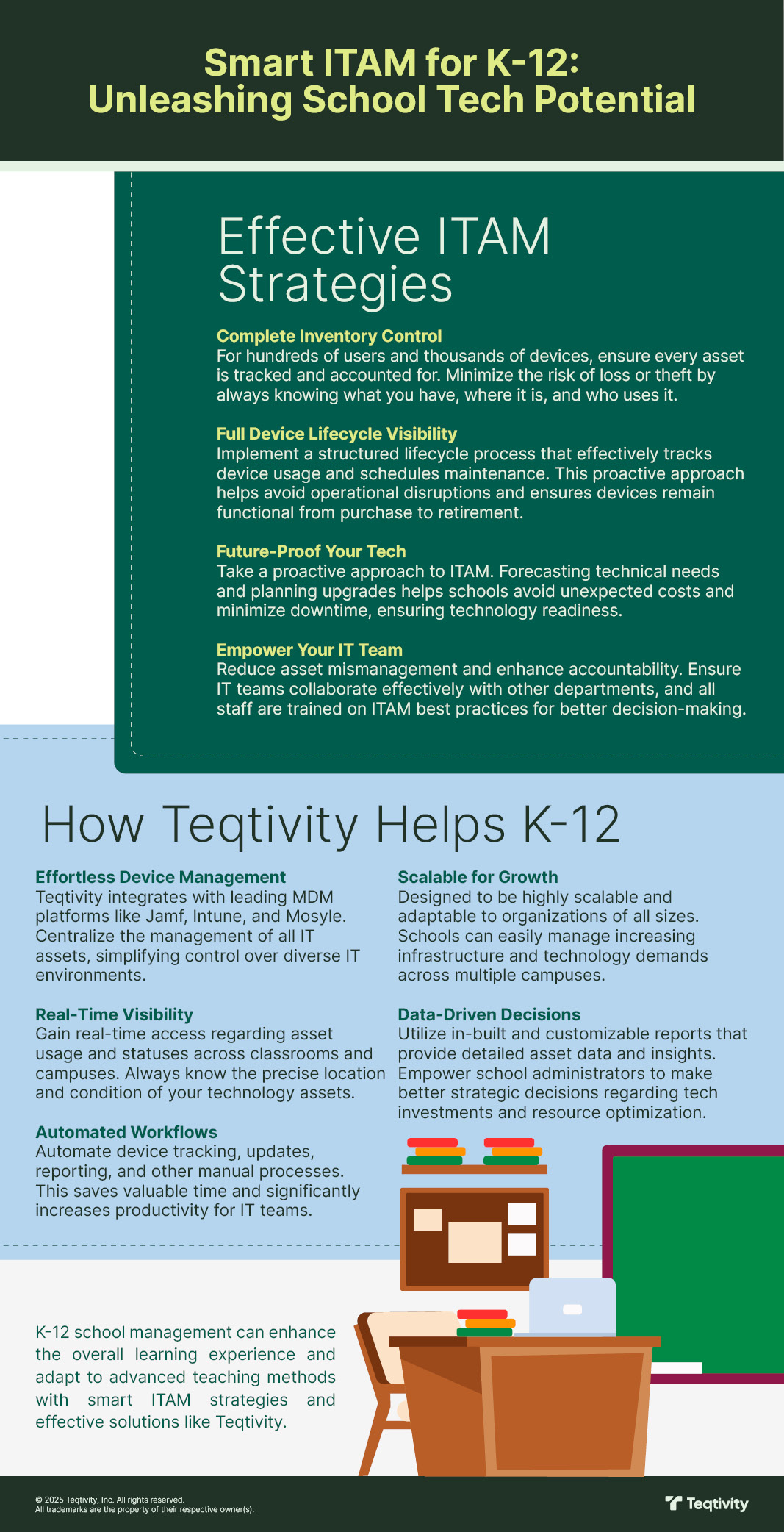 Ensuring every student and teacher has the right tech, at the right time, is crucial for modern K-12 education. But managing hundreds—or thousands—of devices across multiple campuses can be a huge challenge. The below infographic breaks down essential IT Asset Management strategies and shows how Teqtivity helps schools achieve seamless, efficient technology operations.